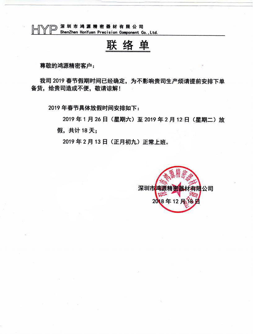 尊敬的鴻源精密客戶,親愛的同事們,大家好!根據國家對2019年元旦/春節節假日時間的具體安排,結合我司實際情況。
