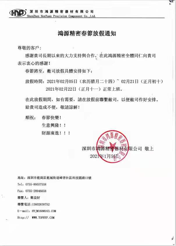 尊敬的(de)鴻源精密客戶(hu),親(qin)愛的(de)同事們,大家(jia)(jia)好!根據國(guo)家(jia)(jia)對2021春(chun)節節假日(ri)時間的(de)具體安排,結合我司實際情況。