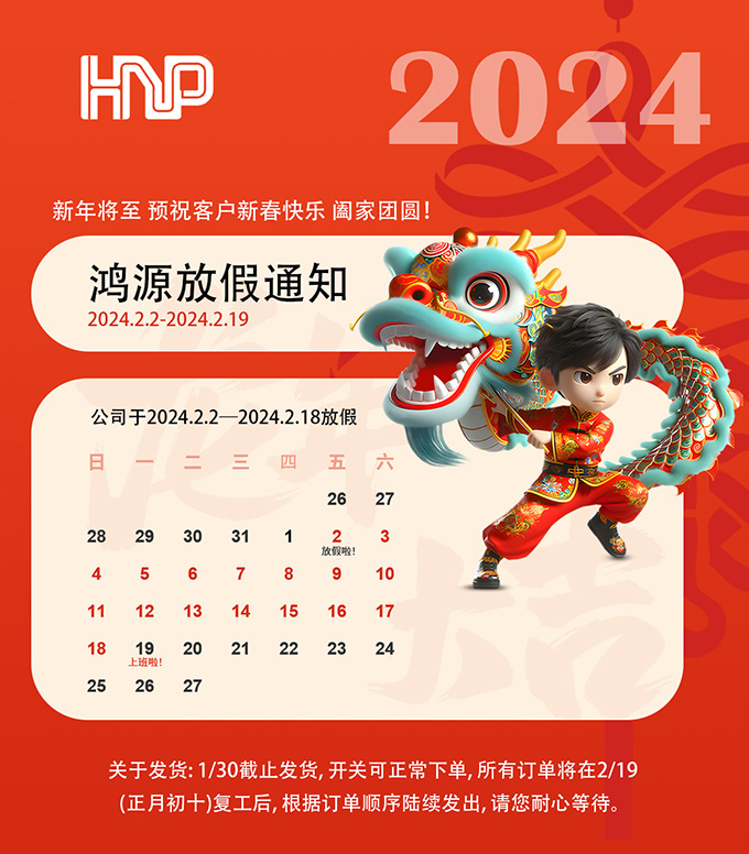 尊敬的鴻源精密客戶,親愛的同事們,大家好!根據國家對2024春節節假日時間的具體安排,結合我司實際情況。