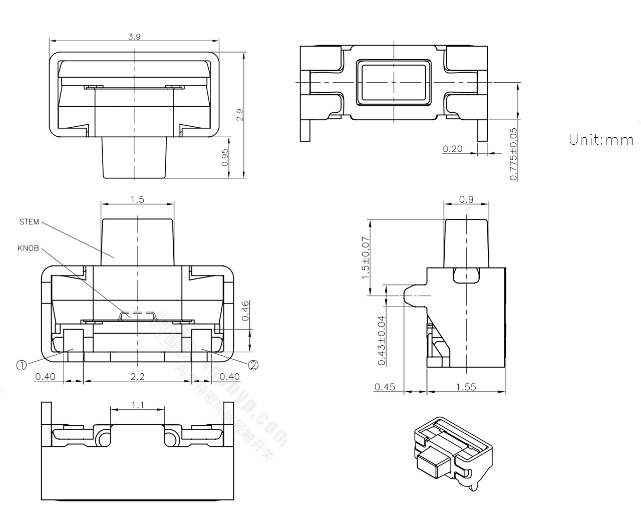 4、產品外形尺寸3.9*2.9*1.55mm,符合業界超薄超小型特色,同時具有laser特點 。