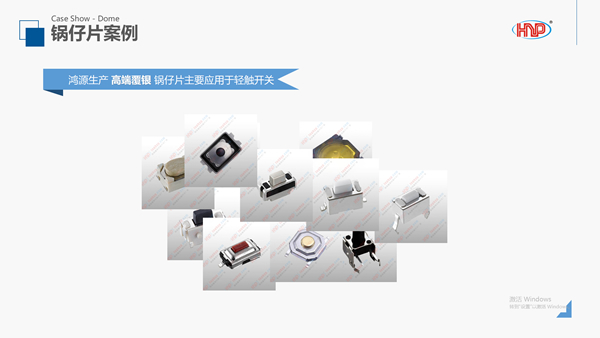 彈片是輕觸開關的心臟, 本公司月產銷彈片3億片, 其中占高端復銀金屬彈片90%市場, 成功取代原日資及韓資公司的同類產品, 從事輕觸開關制造的韓資、港資、內資公司, 均采用我司所生產的彈片。